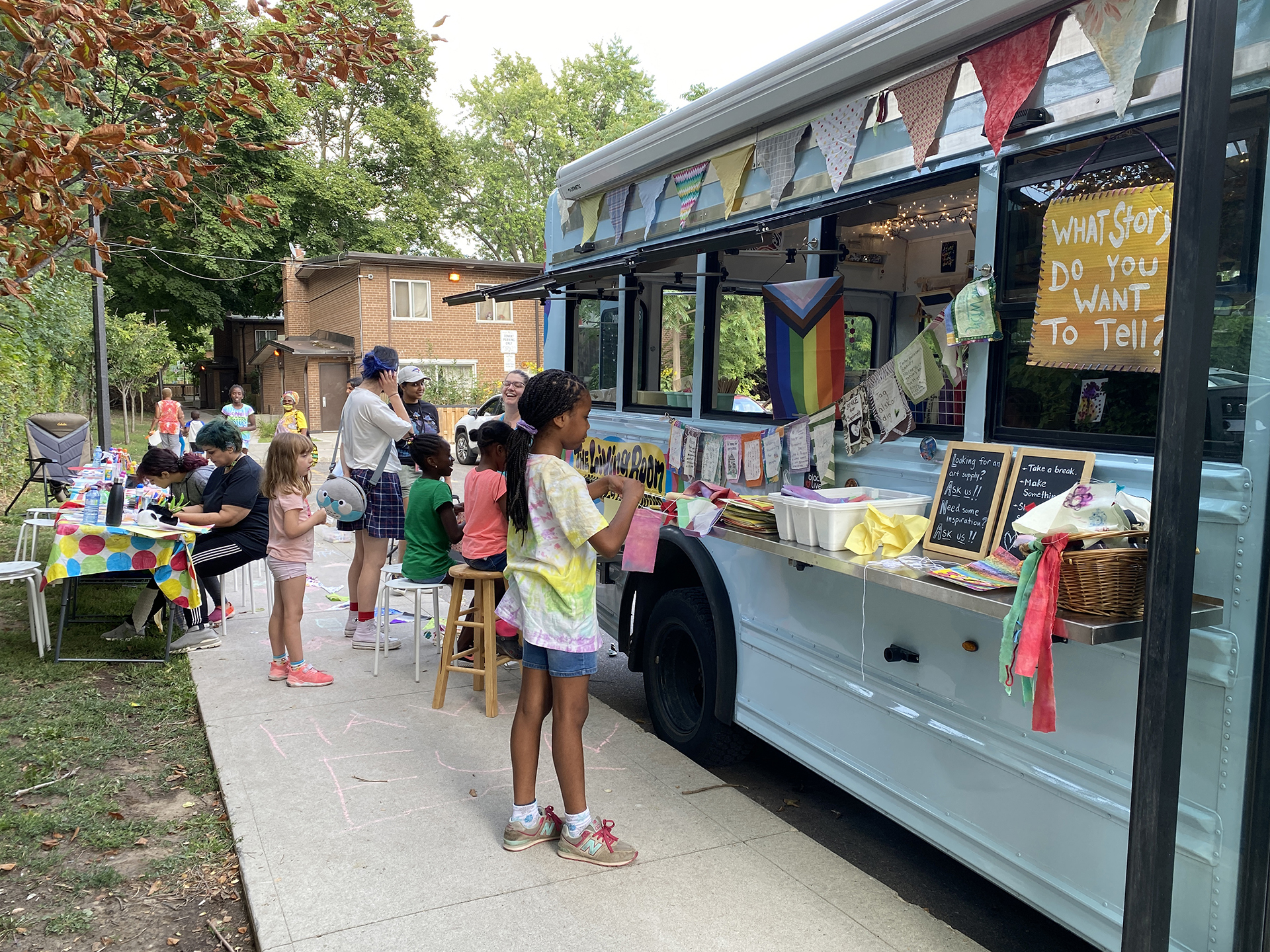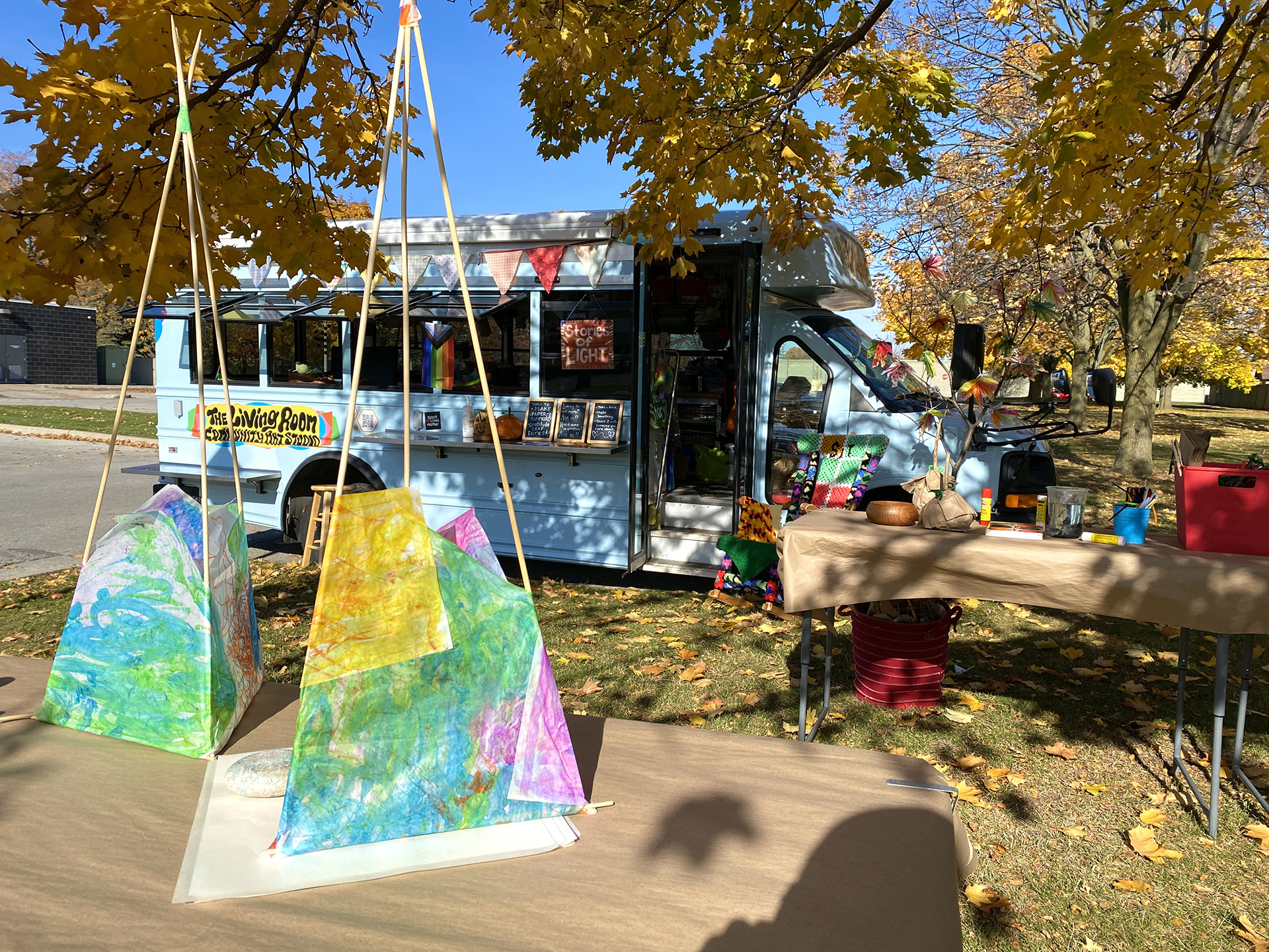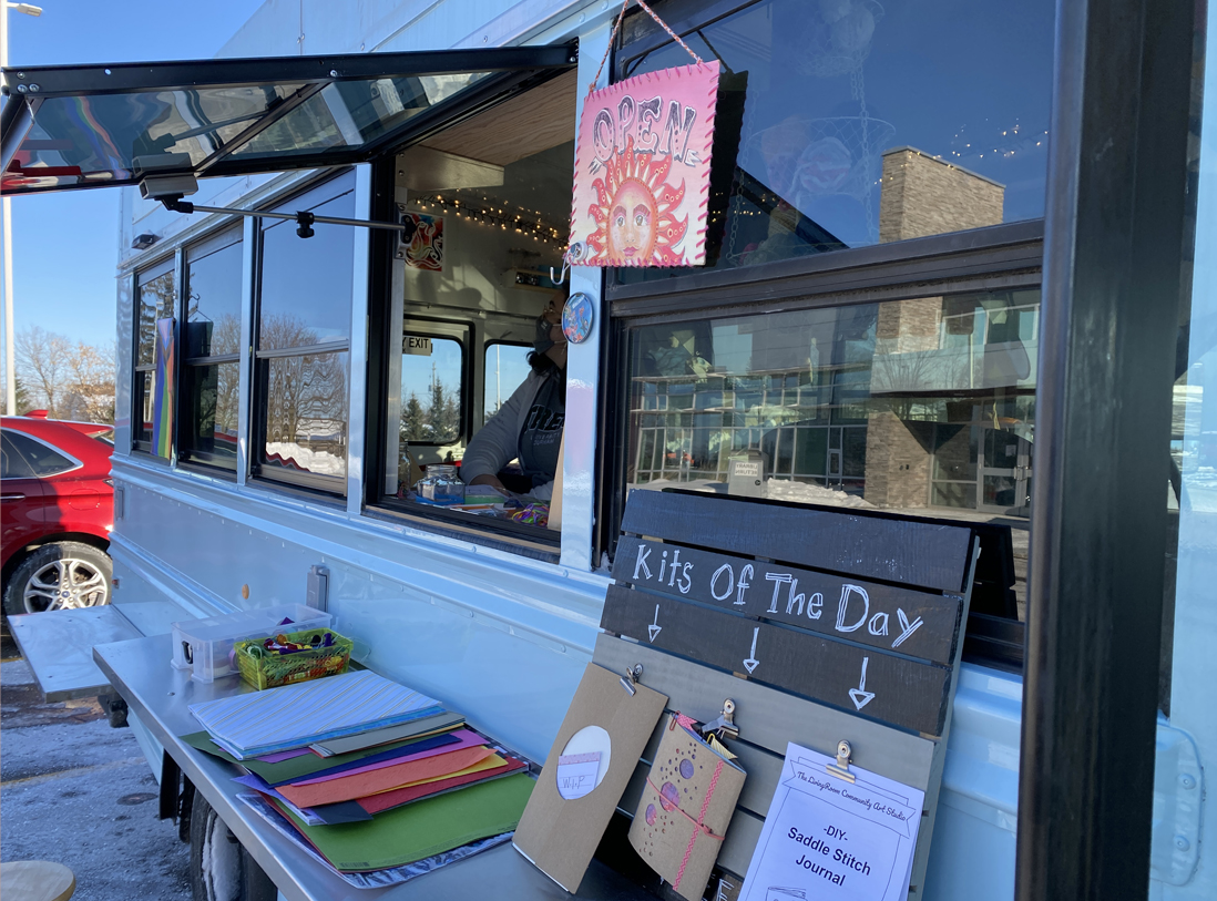 We bring the studio to youThe Mobile Art Studio is a 2009 Chevy short bus that has been converted into an Art Hive, Creative Re-Use centre and place making machine on wheels, with the generous support of the Ontario Trillium Foundation. Part arts outreach adventure and social practice enterprise, the Mobile Art Hive enables us to travel from neighbourhood to neighbourhood, meet people where they are at, and provide free and low cost opportunities for under-served communities from across Durham region and beyond to connect and express themselves creatively. It enables us to learn about what creativity in community means, and explore the ways we can support and be of resource to one another, while honouring the voices of citizen artists and change makers.