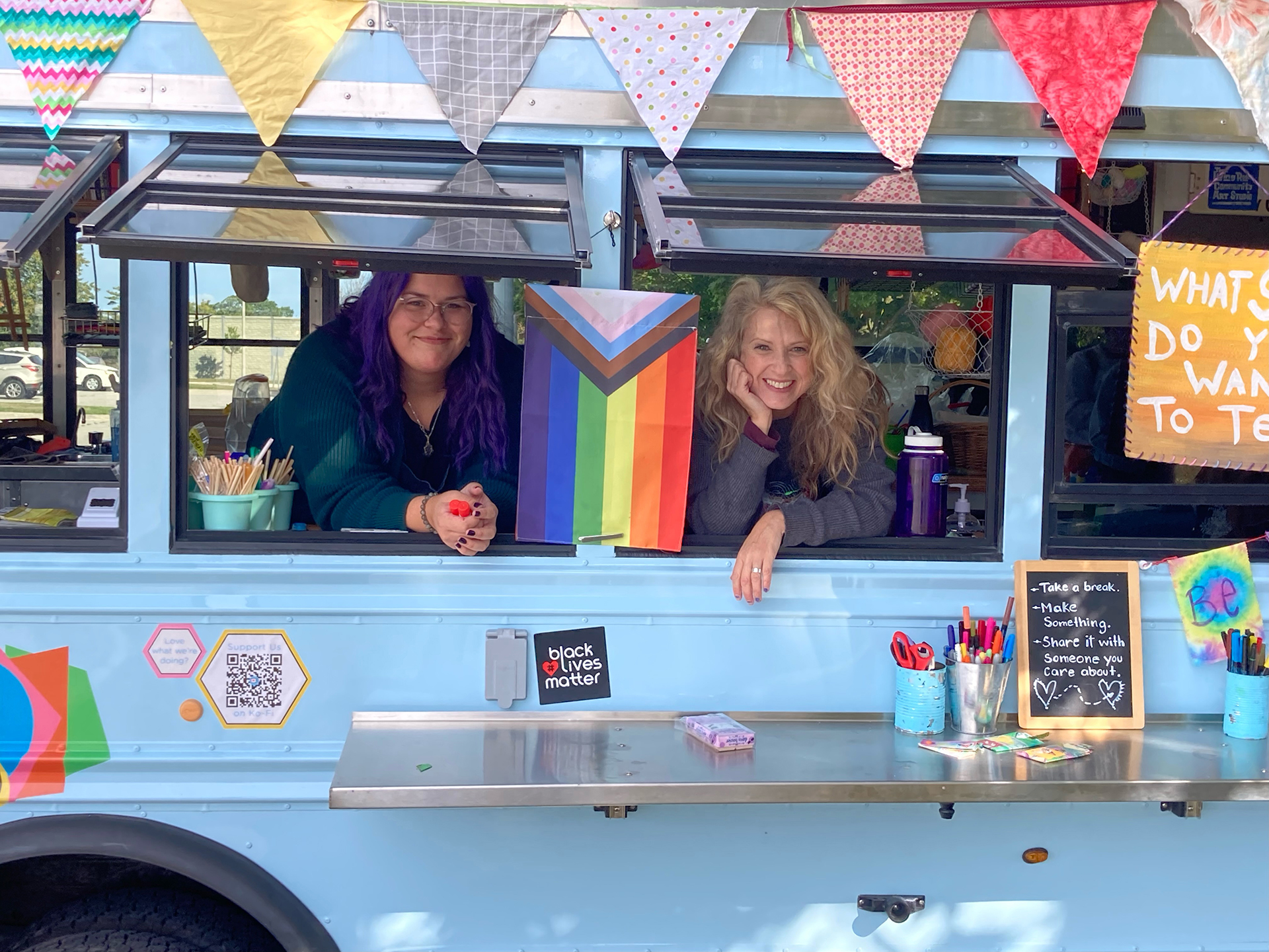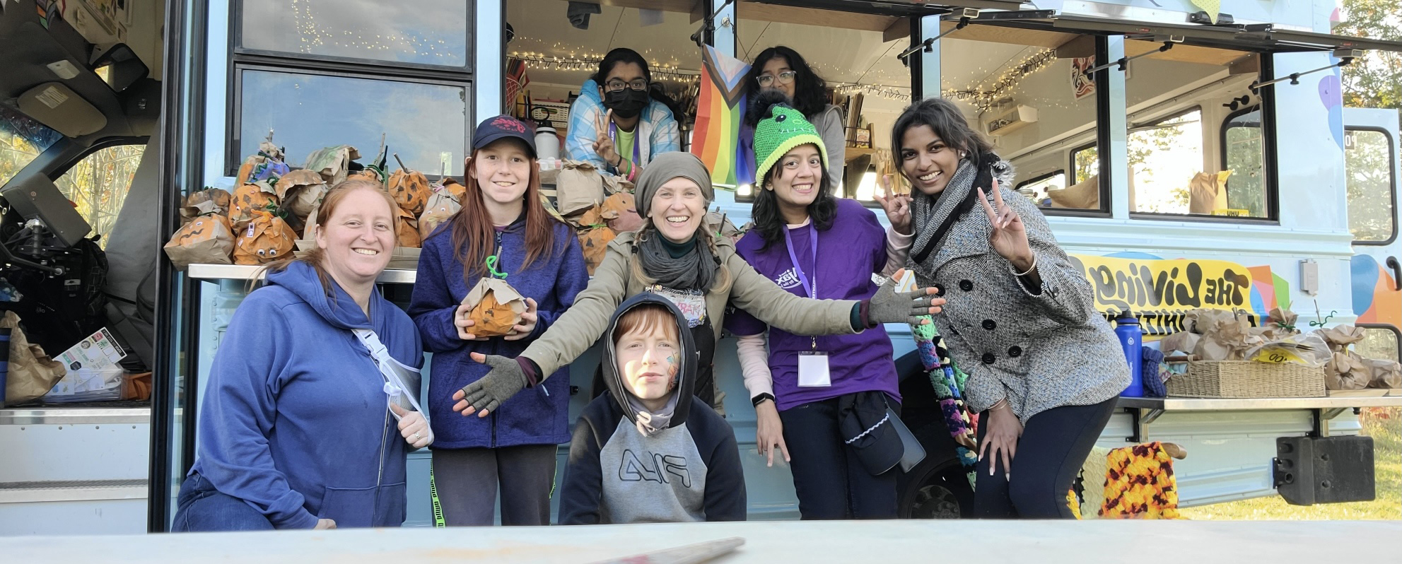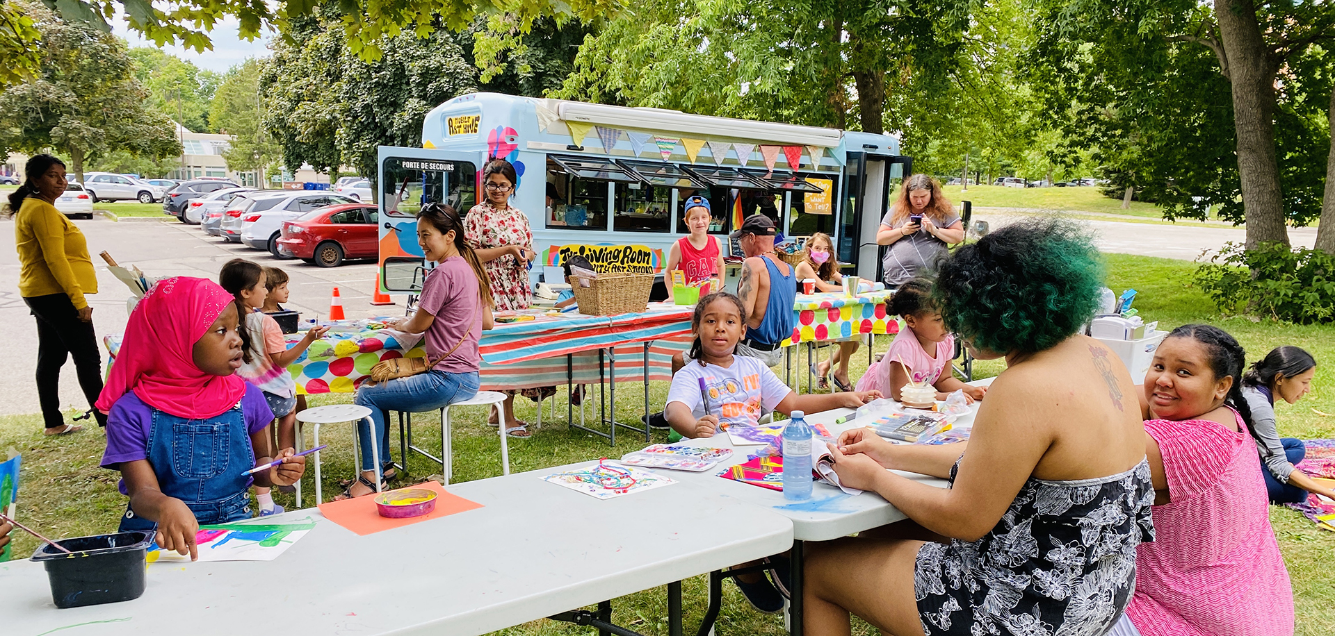 We bring the studio to youThe Mobile Art Studio is a 2009 Chevy short bus that has been converted into an Art Hive, Creative Re-Use centre and place making machine on wheels, with the generous support of the Ontario Trillium Foundation. Part arts outreach adventure and social practice enterprise, the Mobile Art Hive enables us to travel from neighbourhood to neighbourhood, meet people where they are at, and provide free and low cost opportunities for under-served communities from across Durham region and beyond to connect and express themselves creatively. It enables us to learn about what creativity in community means, and explore the ways we can support and be of resource to one another, while honouring the voices of citizen artists and change makers.